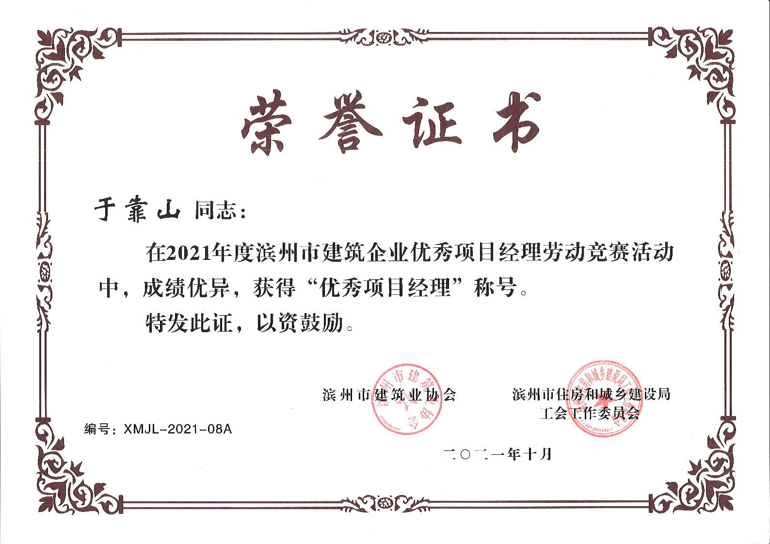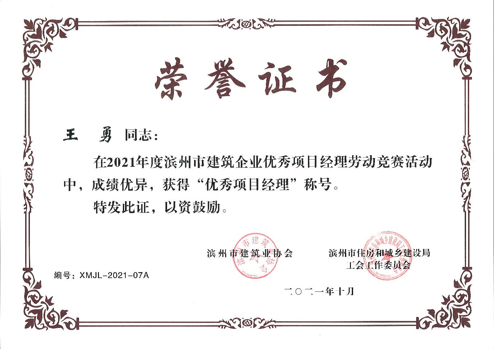在濱州市住建局工會(huì)工委和濱州市建筑業(yè)協(xié)會(huì)組織的2021年度濱州市建筑企業(yè)優(yōu)秀項(xiàng)目經(jīng)理勞動(dòng)競(jìng)賽活動(dòng)中,經(jīng)公司推薦、競(jìng)賽工作委員會(huì)評(píng)議審定和綜合評(píng)審、網(wǎng)上公示等工作程序,我公司三名同志(王勇同志、房磊同志、于靠山同志)獲評(píng)“優(yōu)秀項(xiàng)目經(jīng)理”稱號(hào)。